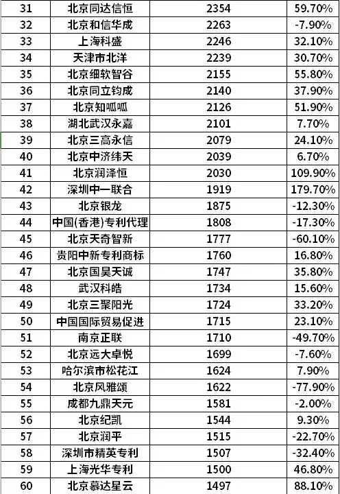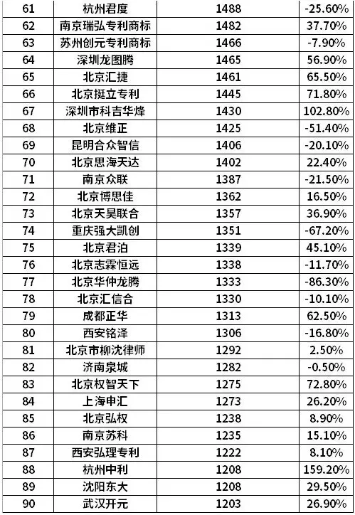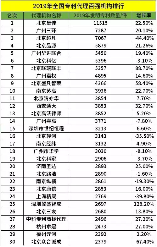 排行依據(jù):排行以2019年發(fā)明申請公開專利為依據(jù),對發(fā)明案件前一百代理機構(gòu)進行排行。其中為保證增長率數(shù)據(jù)更具準確性,選擇發(fā)明申請日在2018年且首次公開日為2018年的發(fā)明申請進行增長率計算。